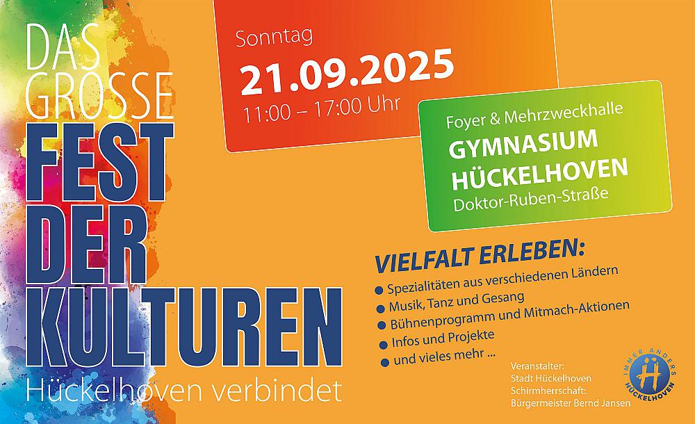 Am Sonntag, 21. September 2025, findet von 11:00 Uhr bis 17:00 Uhr das siebte Fest der Kulturen in der Mehrzweckhalle und im Foyer des Gymnasiums Hückelhoven statt - das große Eröffnungsfest der Interkulturellen Woche 2025.